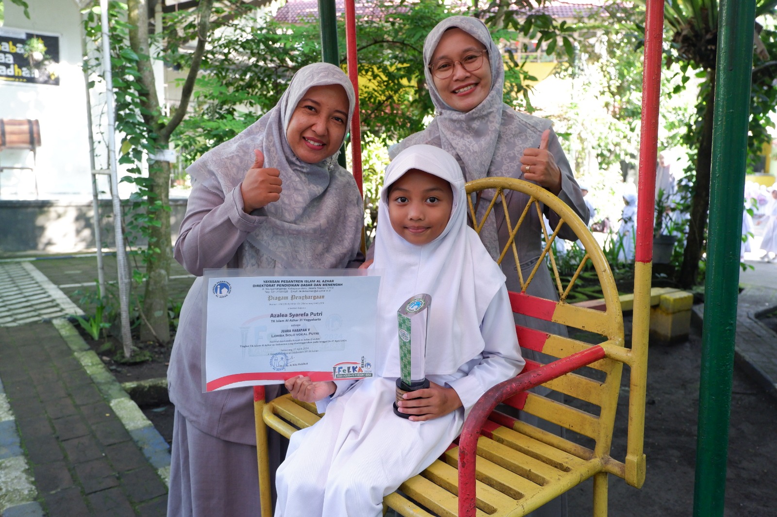 Sebagai hasilnya Azalea Syareefa Putri mendapatkan juara harapan V lomba menyanyi kategori Solo Vokal Putri tingkat TK Islam Al Azhar se – Indonesia. (Hilmi AB)