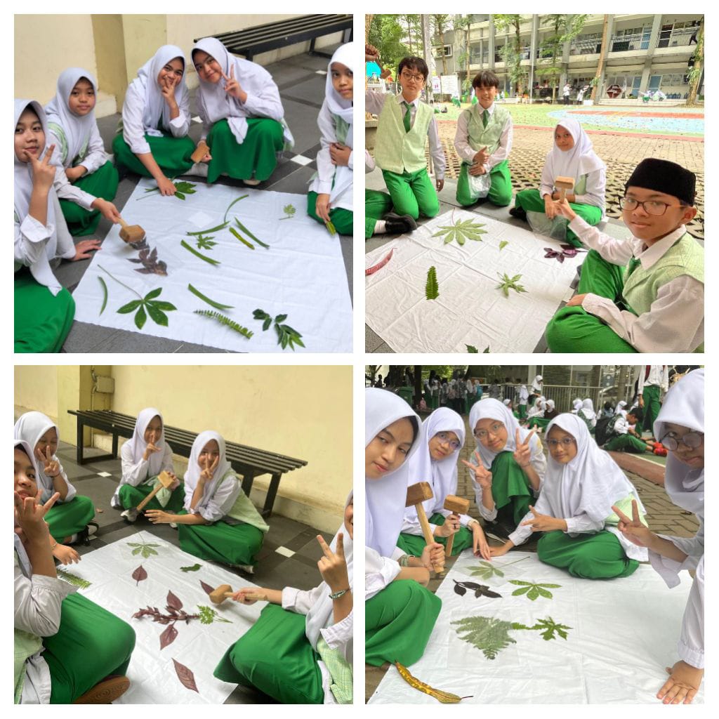 Ecoprint sendiri adalah teknik mencetak motif alami pada kain dengan memanfaatkan pigmen tumbuhan—seperti klorofil, antosianin, dan flavonoid—yang berpindah melalui tekanan mekanis. Melalui metode ini, murid belajar tentang struktur daun, jenis pigmen alami, proses transfer warna, hingga interaksi material alam dengan media kain. Semua konsep sains itu hadir bukan sebagai teori, melainkan pengalaman ilmiah yang menyenangkan.
