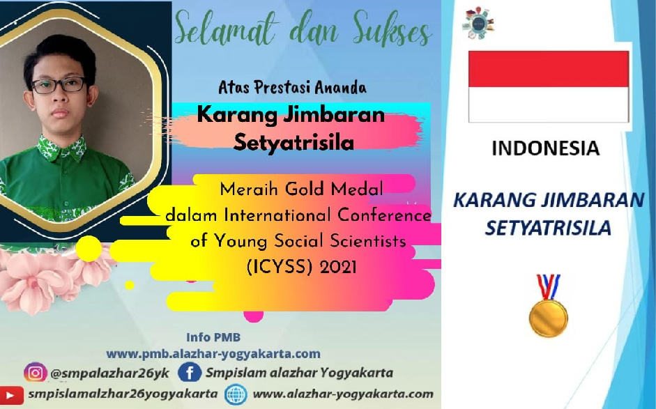 Perasaan bangga kembali disematkan kepada salah satu murid berprestasi SMPI Al Azhar 26 Yogyakarta. Alhamdulillah, SMP Islam Al Azhar 26 Yogyakarta berhasil meraih prestasi gemilang di Lomba International Conference Of Young Social Scientists (ICYSS) 2021 secara online dari Belgrade, Serbia, Eropa yg diikuti oleh 11 Negara dari seluruh dunia.