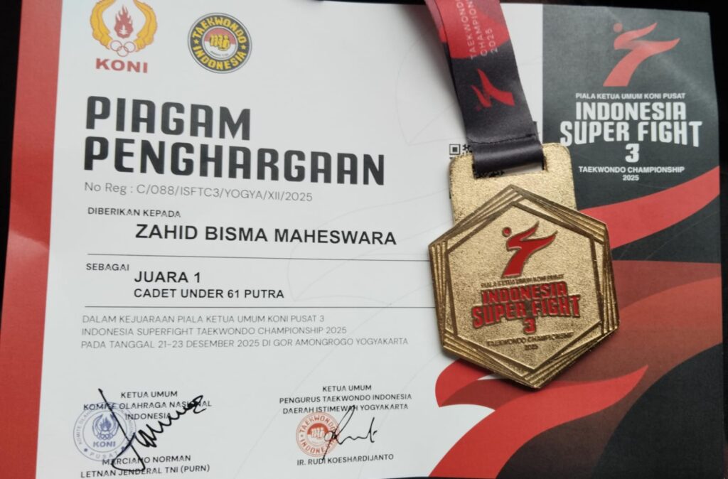 BANTUL – Prestasi membanggakan kembali ditorehkan murid Al Azhar Yogyakarta World Schools (AYWS). Zahid Bisma Maheswara,, murid kelas 9 Al Fatih SMP Islam Al Azhar 66 Bantul, sukses mengharumkan nama sekolah dan institusi dengan meraih Juara 1 kategori Cadet Under 61 Putra pada ajang Piala Ketua Umum KONI Pusat 3 Indonesia Super Fight Taekwondo Championship 2025. Kejuaraan nasional tersebut berlangsung pada 21–23 Desember 2025 di GOR Amongrogo, Yogyakarta, dan diikuti ratusan atlet terbaik dari berbagai daerah di Indonesia.