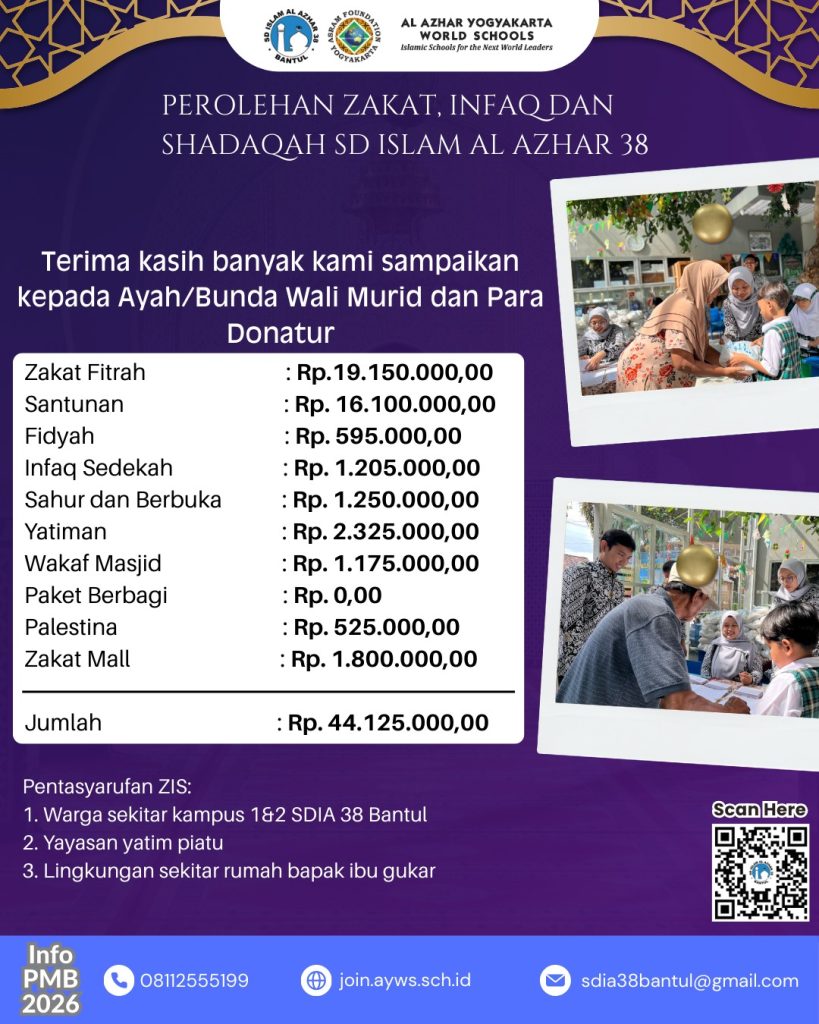 Pada tahun ini, total dana ZIS yang terkumpul mencapai Rp44.125.000 dan diwujudkan dalam 400 paket zakat yang dibagikan kepada warga prasejahtera di sekitar lingkungan sekolah. Program berbagi ini menjadi wujud nyata kepedulian sosial sekolah sekaligus upaya mempererat hubungan antara SD Islam Al Azhar 38 Bantul dengan masyarakat sekitar.
