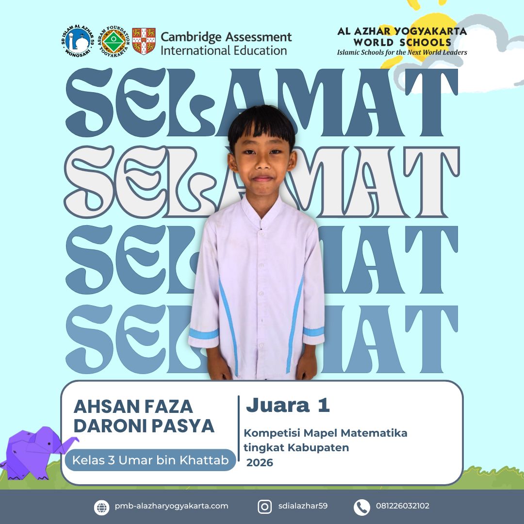 WONOSARI – Prestasi membanggakan kembali ditorehkan oleh siswa SD Islam Al Azhar 59 Wonosari. Ananda Ahsan Faza Daroni Pasya, siswa kelas 3, berhasil meraih Gold Award Matematika dalam ajang Kompetisi Mata Pelajaran Matematika, Sains, dan Bahasa Inggris tingkat Daerah Istimewa Yogyakarta (DIY) Tahun 2026.