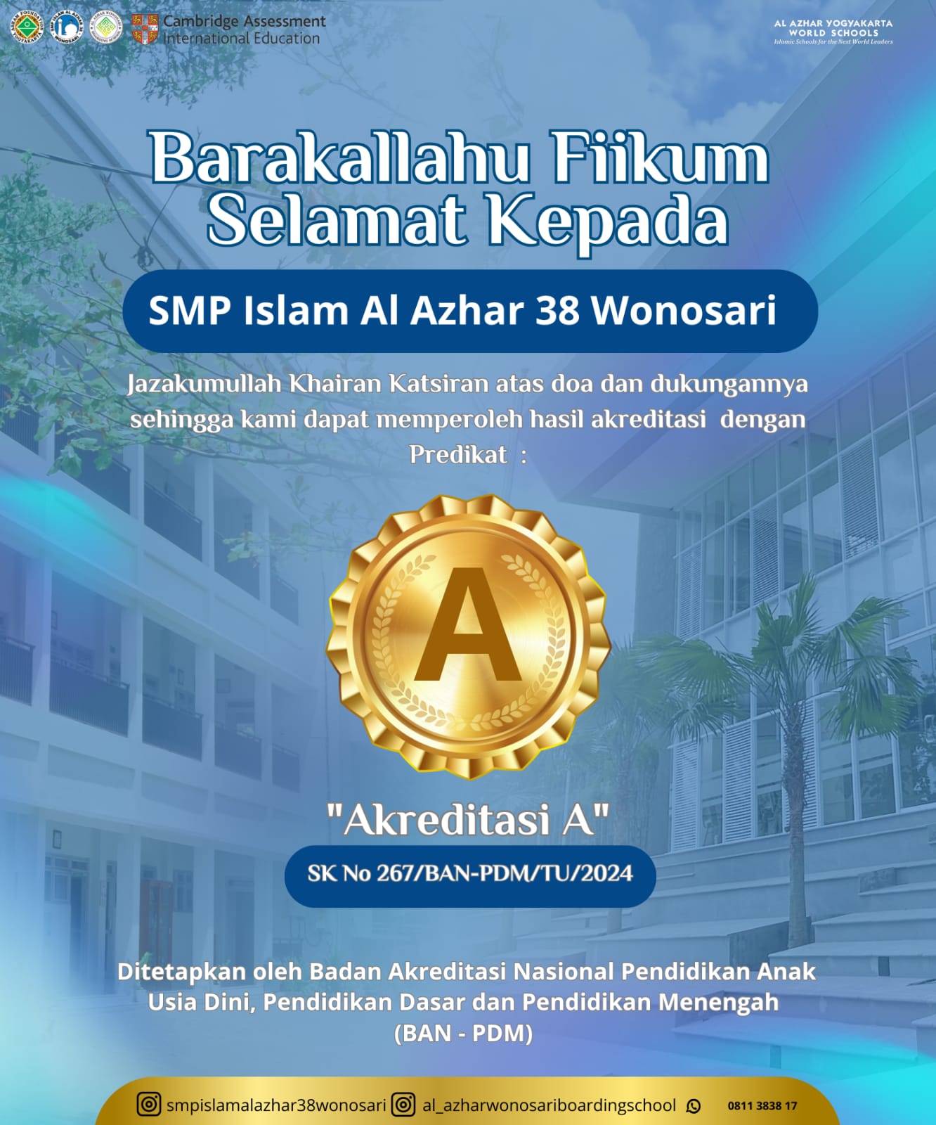 WONOSARI — Senin (30/12/24), SMP Islam Al Azhar 38 Wonosari berhasil memperoleh predikat Akreditasi A dari Badan Akreditasi Nasional Pendidikan Anak Usia Dini, Pendidikan Dasar, dan Pendidikan Menengah (BAN-PDM). Kabar bahagia ini menegaskan kualitas pendidikan yang ditawarkan sekolah sebagai lembaga yang unggul dan berdaya saing tinggi.