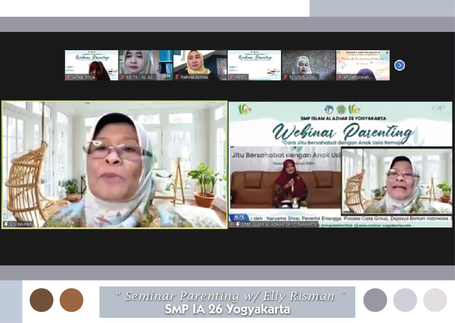 Webinar parenting yang merupakan salah satu rangkaian perayaan 1 Dekade SMP Islam Al Azhar 26 Yogyakarta terselenggara pada hari kedua yakni Selasa, 19 Januari 2021 pukul 09.00 – 12.00 WIB. Bersama pembicara kawakan Elly Risman, Psi yang mana merupakan psikolog dan pendiri Yayasan Kita dan Buah Hati mampu menarik minat banyak orang tua dan masyarakat umum untuk ikut dama webinar parenting tersebut.