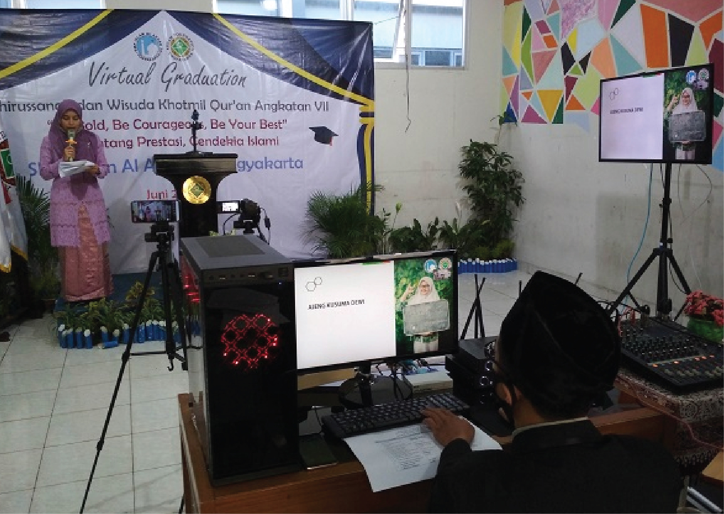 SMP Islam Al Azhar 26 Yogyakarta mengadakan virtual graduation, akhirussanah dan tasyakur wisuda khotmil quran untuk siswa kelas IX (angkatan VII) di kampus setempat, Jalan Padjajaran (Ringroad Utara) Sinduadi Mlati Sleman, Rabu (24/6). Tahun ajaran 2019/2020 ini jumlah siswa yang diwisuda sebanyak 145 siswa atau lulus 100%. Kepala SMP Islam Al Azhar 26 Yogya Agung Widiyantoro MPd mengatakan, wisuda tahun ini sangat istimewa dibanding tahun-tahun sebelumnya karena diselenggarakan secara virtual. Ini pilihan terbaik sesuai anjuran pemerintah untuk mencegah penularan Covid-19. Saat prosesi wisuda, seluruh wisudawan berada di rumah masing-masing didampingi orangtua dan mengikuti jalannya acara menggunakan aplikasi zoom meeting. Penyematan samir kepada wisudawan diwakili oleh orangtua. Acara wisuda diikuti Ketua Yayasan Asram yang membawahi Al Azhar Yogyakarta Drs HA Hafidh Asrom MM yang menyampaikan selamat kepada para wisudawan sekaligus mengapresiasi para orangtua siswa yang telah mendukung pendidikan putraputrinya selama bersekolah di Al Azhar Yogyakarta. Ketua Jam’iyah (komite sekolah) SMP Islam Al Azhar 26 Yogya, Primira Kartika Banjarini Putri SE berpesan kepada para lulusan virtual jangan berkecil hati. Wisuda virtual ini justru menjadi momen spesial yang tidak akan pernah dilupakan.